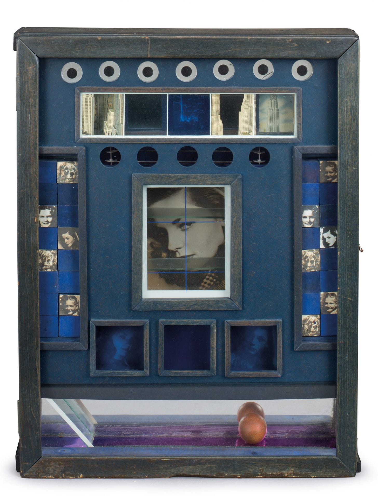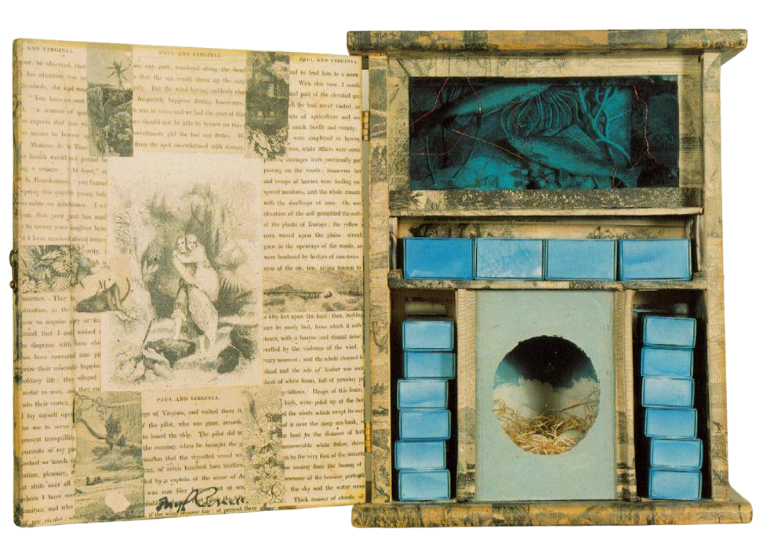 These poetic theaters are a deliberate assemblage of collected, found objects: typed and handwritten notes, exhibition announcements, magazine clippings, postcards, bird feathers, watch parts, metal discs, marbles, compasses, and on, building files akin to “the image-making of poetry.”